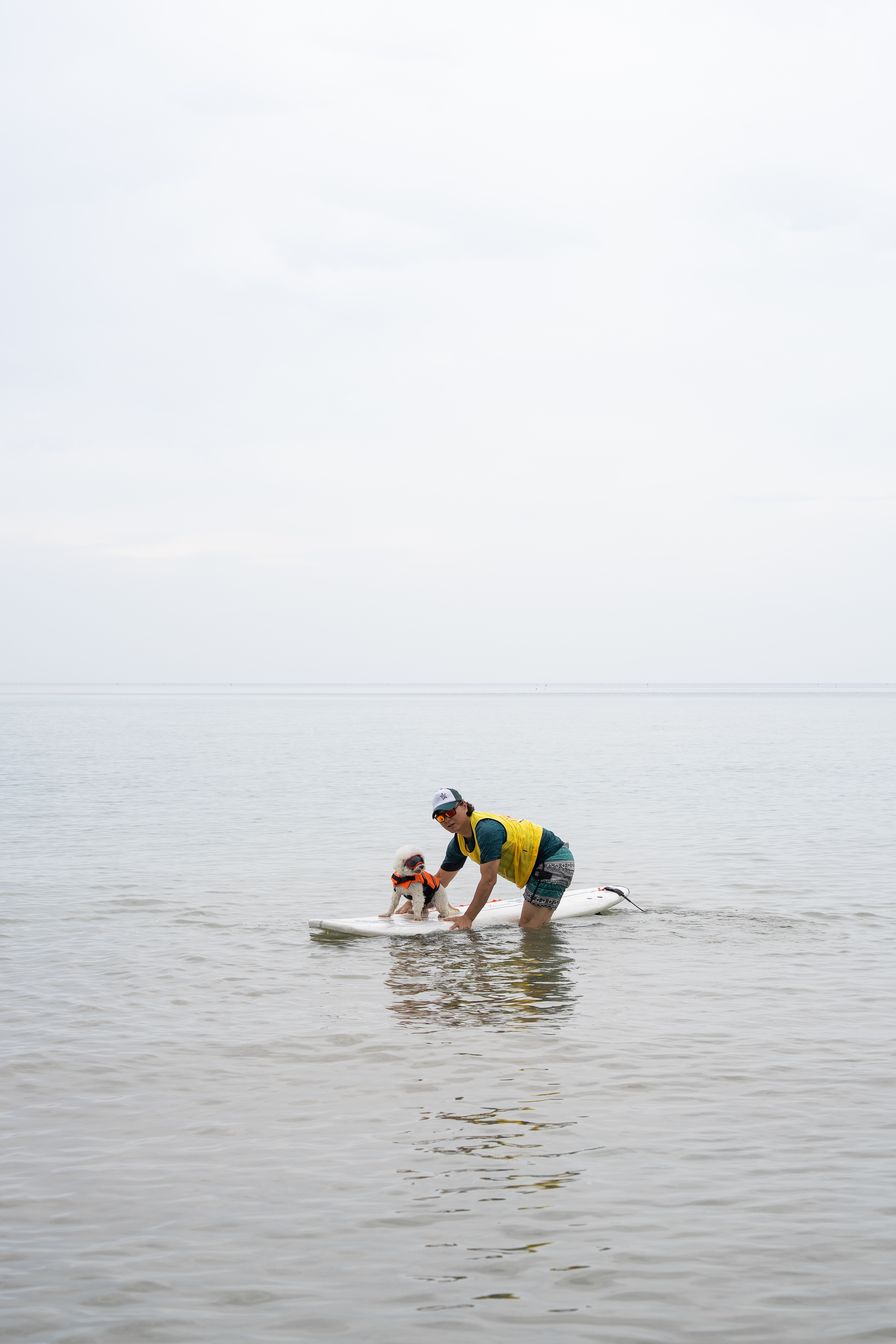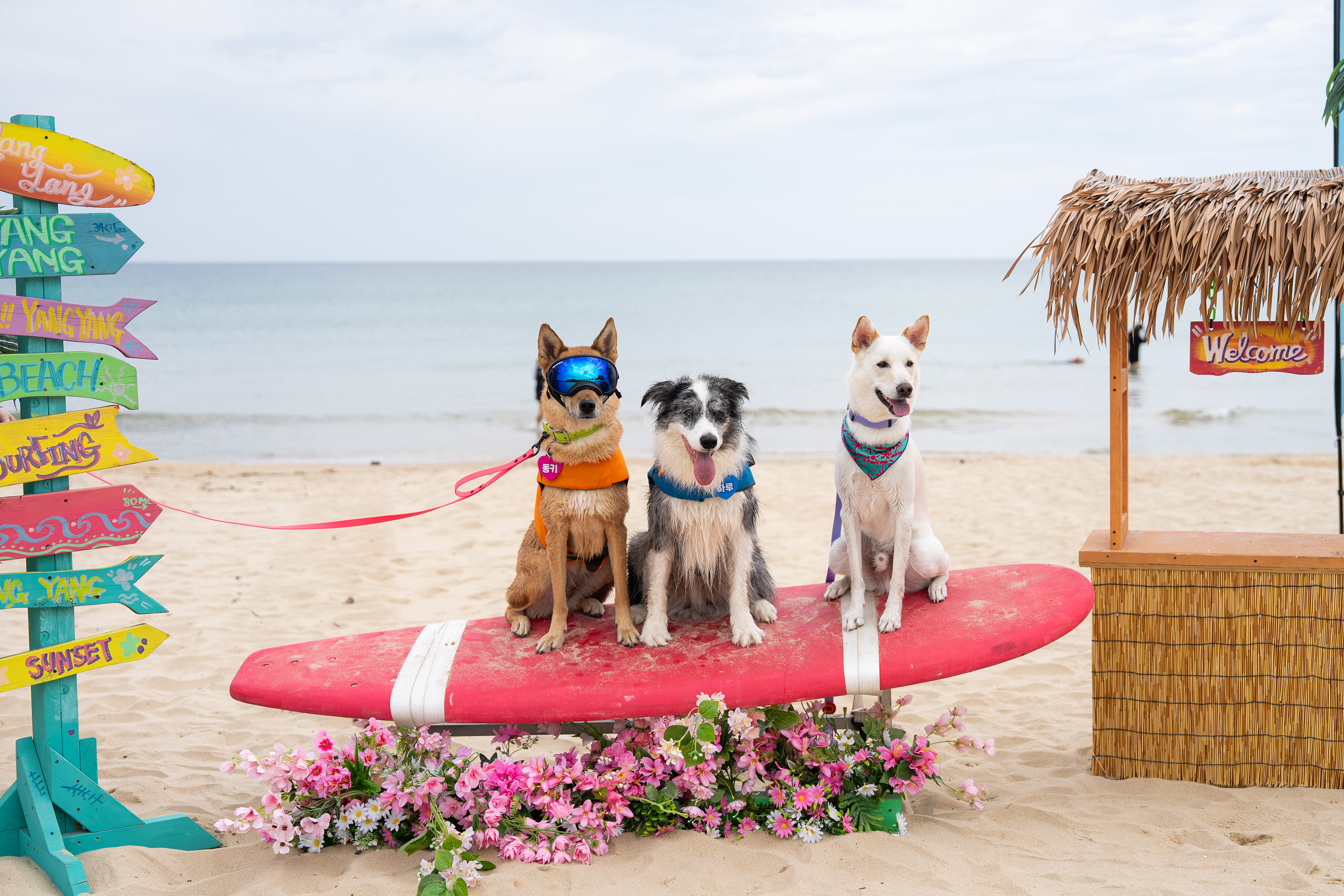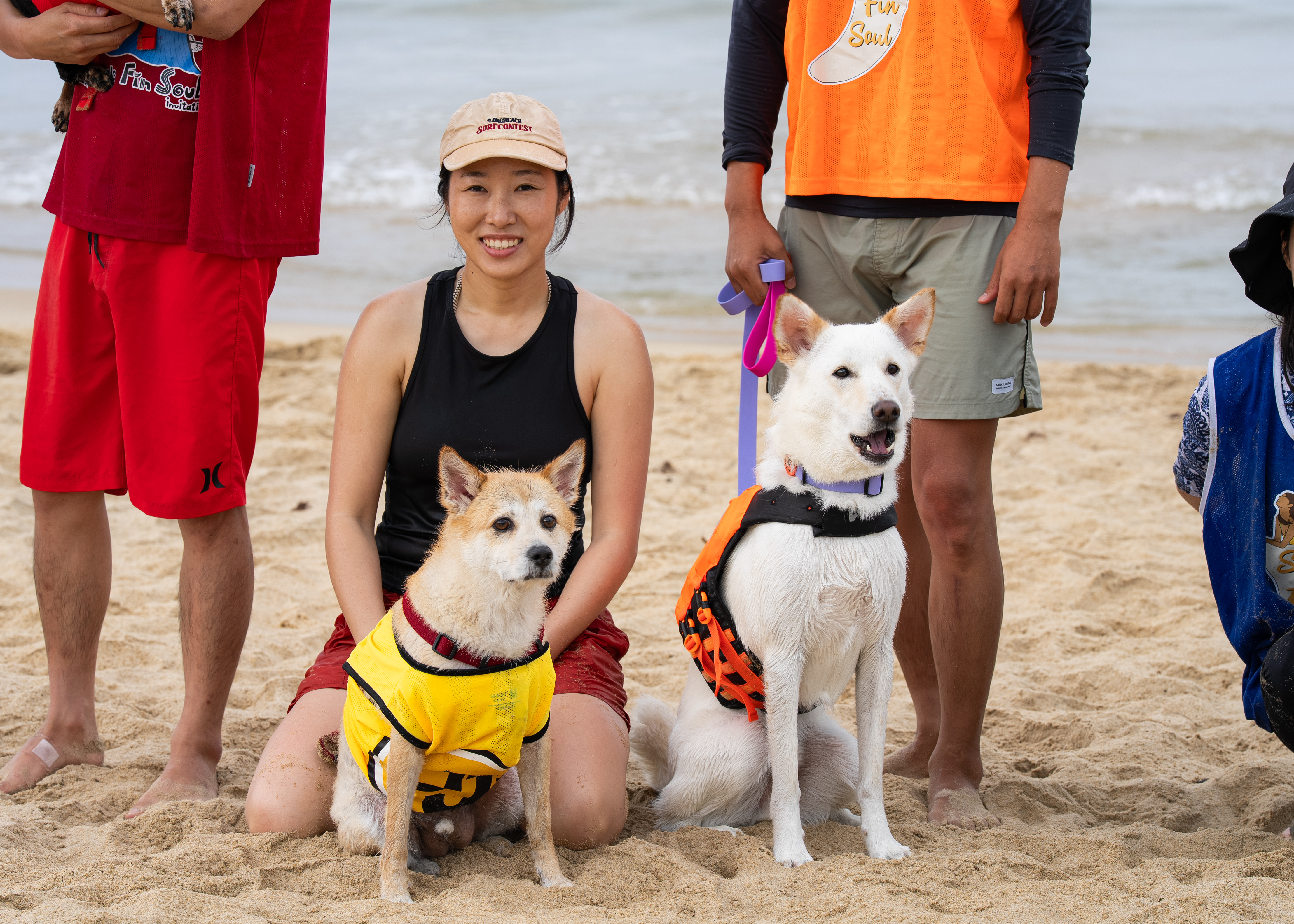 서핑댕회의 하이라이트. 서핑보드 위에 댕댕이 + 반려인이 함께 파도를 탄다. 공식 서핑 강사 인솔 · 완주 시간 기록 · 난이도별 두 개 조로 운영.