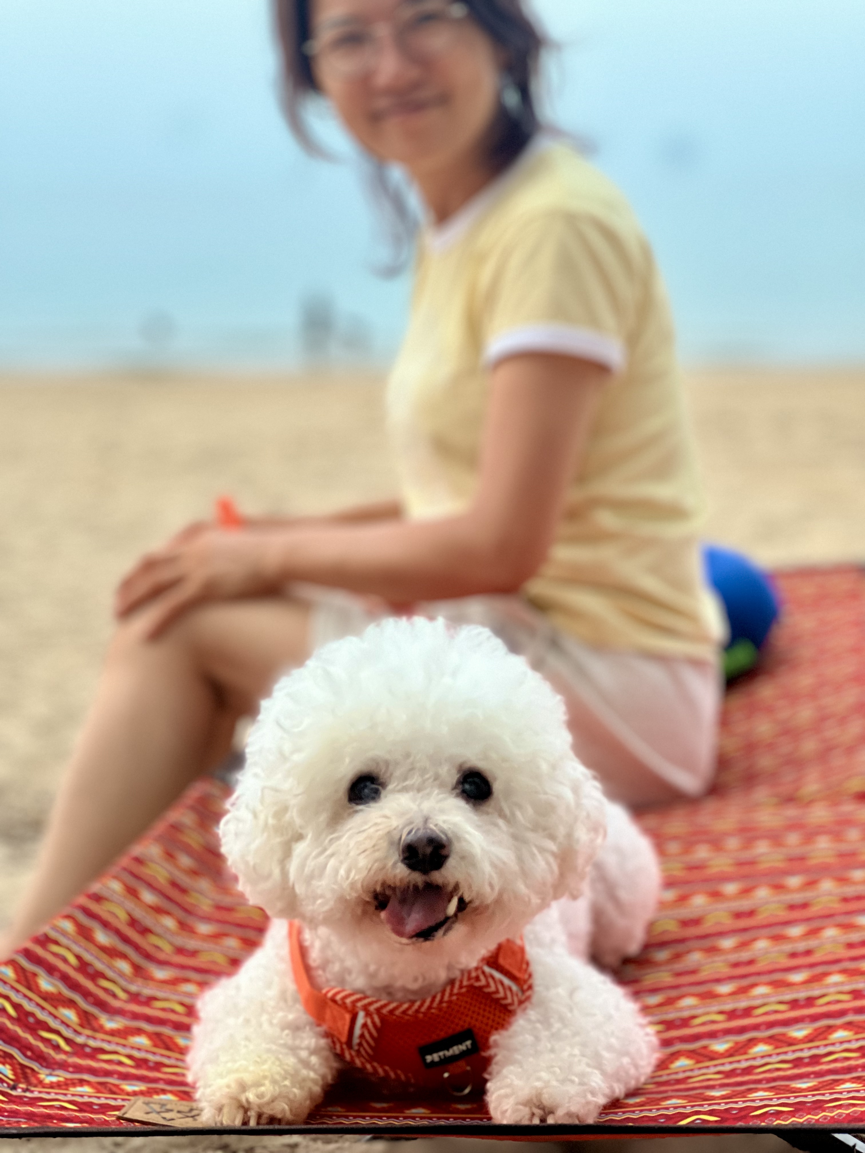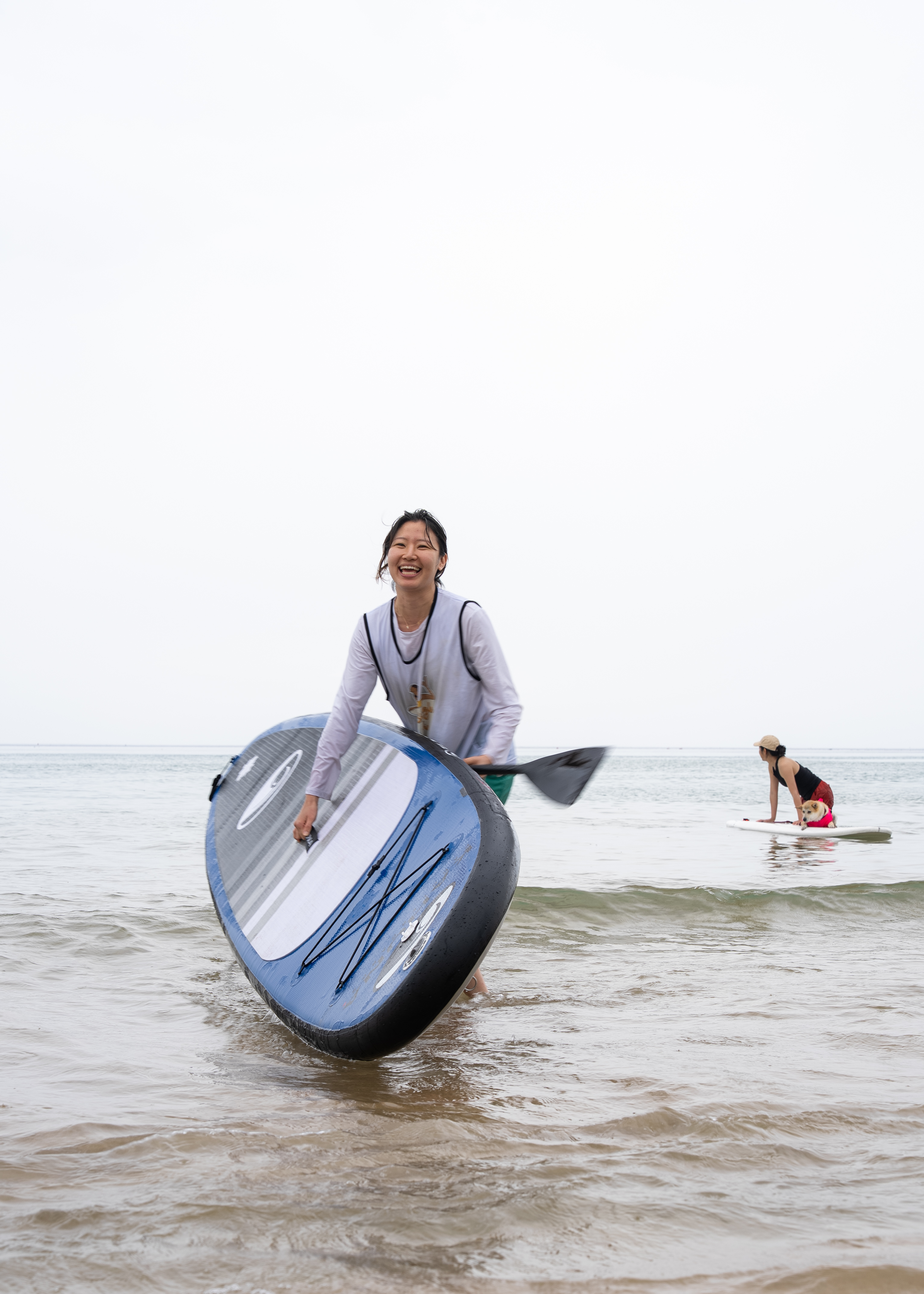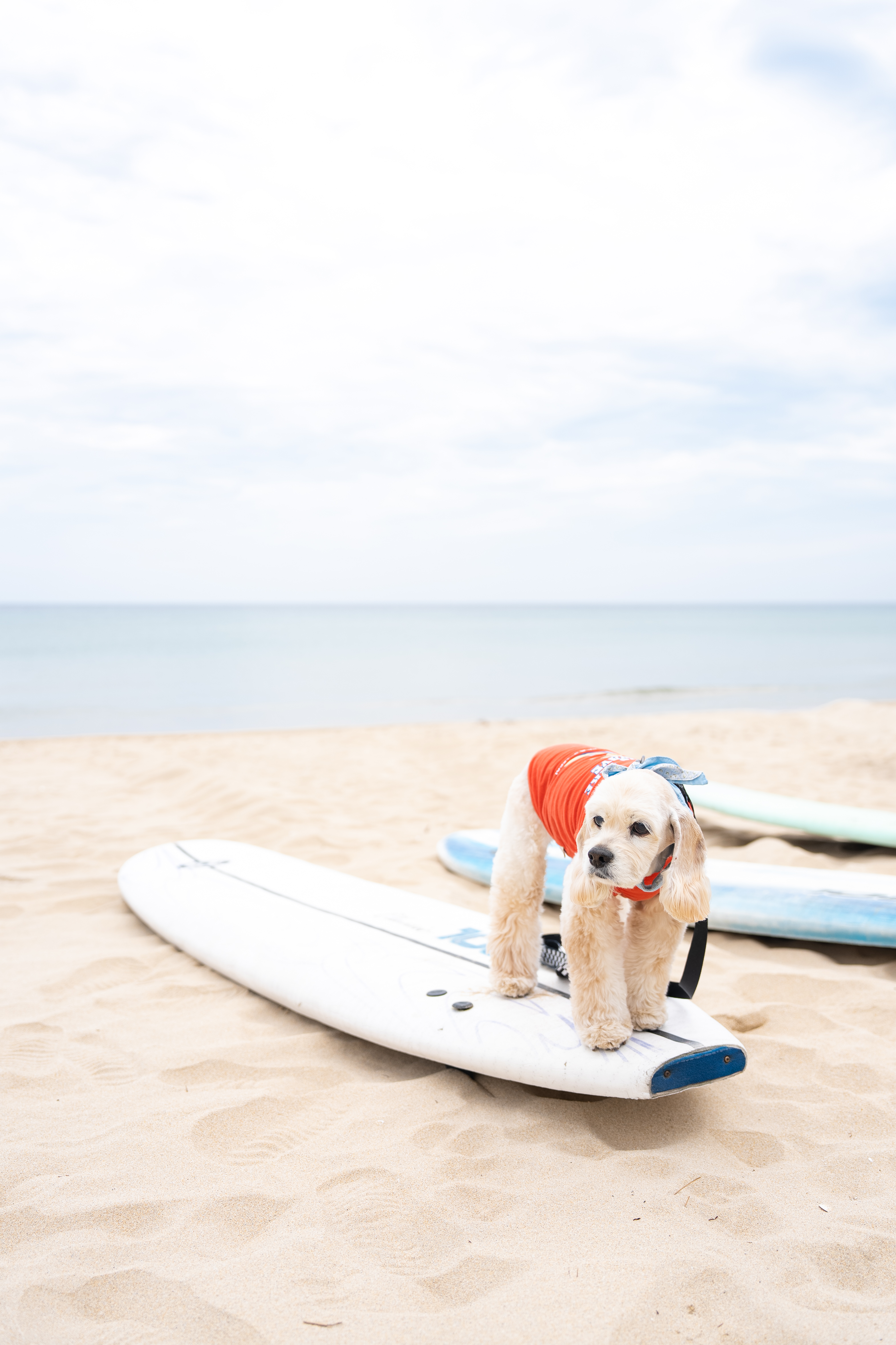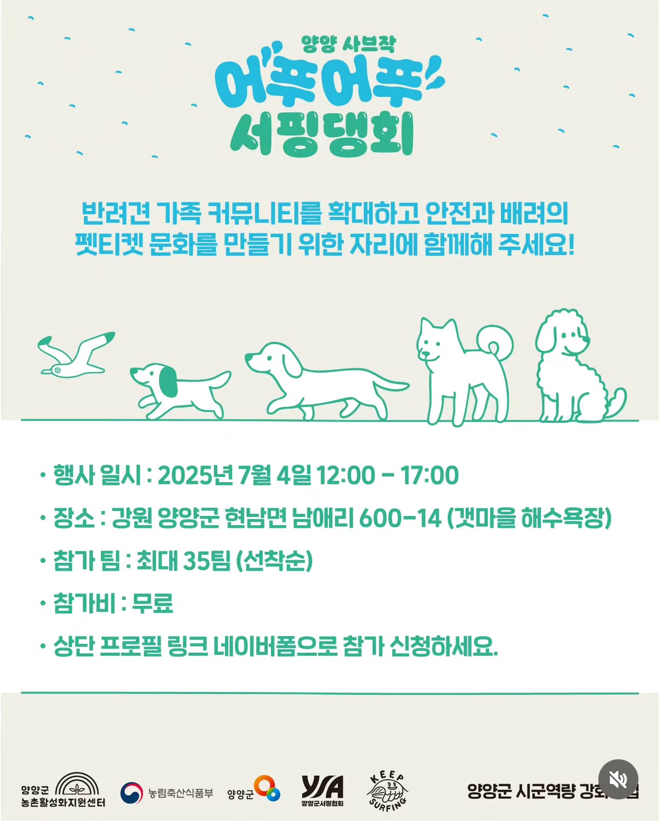 서핑댕회의 하이라이트. 서핑보드 위에 댕댕이 + 반려인이 함께 파도를 탄다. 공식 서핑 강사 인솔 · 완주 시간 기록 · 난이도별 두 개 조로 운영.